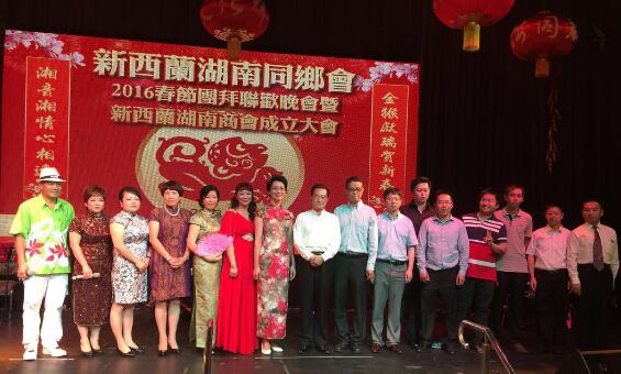 人民网北京2月14日电 据新西兰中华新闻网消息,2月12日大年初五,新西兰湖南同乡会“庆祝2016年猴年新春佳节晚会”及“新西兰湖南商会成立庆典”在奥克兰隆重举行。400多位来自中国湖南的侨胞相亲以及当地华社侨领、各界知名人士欢聚一堂共庆中国猴年的到来,同时祝贺新西兰湖南商会正式成立。中国驻奥克兰总领馆湛玉会领事代表总领馆专程出席庆典活动表示祝贺,新西兰工党前党?、国会议员菲尔高夫先生,国家党华人国会议员?罱〔┦俊⑿卸?郴?烁钡?王小选先生等政要应邀出席活动。