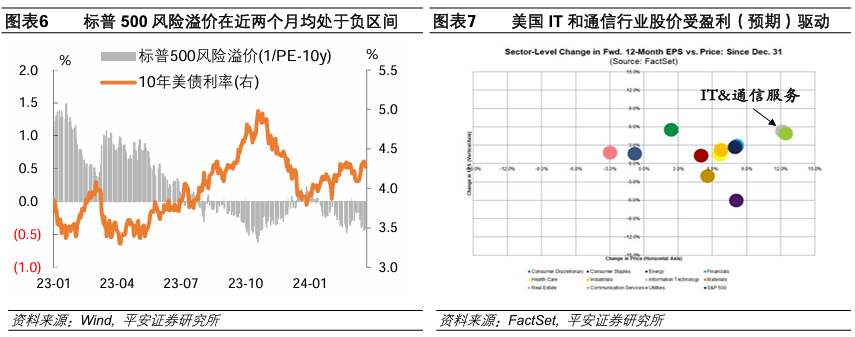 美股:估值担忧与美债利率上行或制造压力,但科技股行情可能相对独立。目前美国经济增长势头不错,但降息预期也在降温,投资者需要在乐观的盈利前景与上升的估值压力中寻求平衡。今年以来截至3月19日,标普500指数又创新高,年内累涨8.6%(年化39%)。截至3月20日,标普500指数PE达到25.8倍,为1990年以来的85%分位以上,处于历史较高水平,标普500指数风险溢价在近两个月均处于负区间。但另一方面,据FactSet统计,美股IT和通信行业股价上涨与(未来一年)盈利预期增长幅度良好匹配,说明美股科技股呈现“盈利驱动”特征,估值和风险溢价的压力可能不是投资者配置科技股的核心考虑。