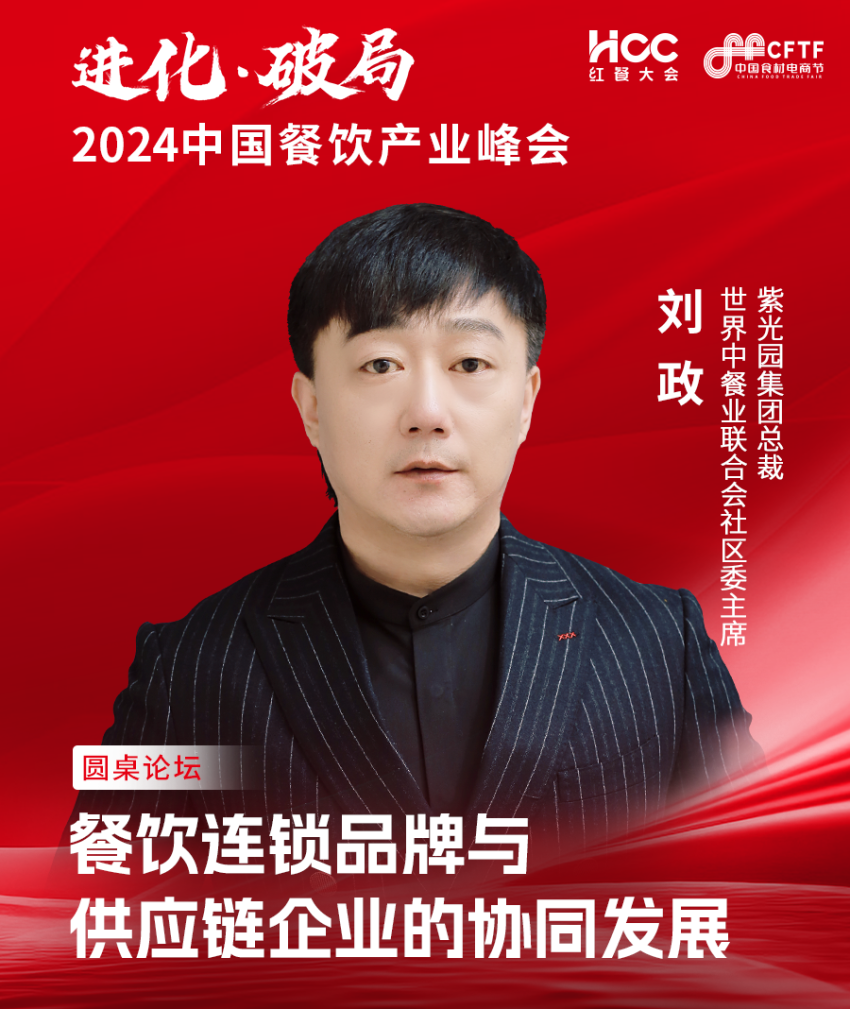 刘政,现任世界中餐业联合会社区委主席,紫光园集团总裁。北京市紫光园餐饮有限责任公司,是一家以清真北京菜为主,连锁经营的大型餐饮企业,现已成为老北京饮食文化和清真饮食文化的传承者和推动者。