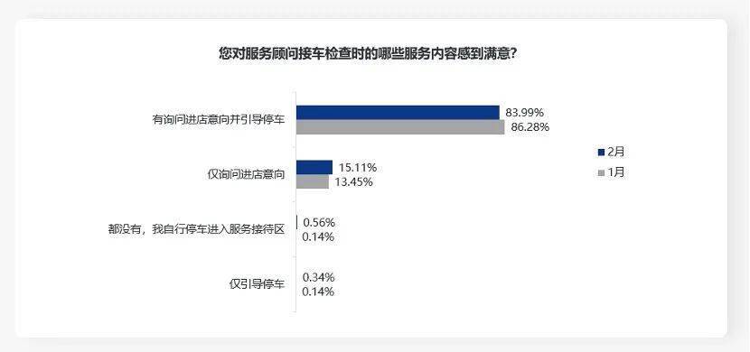 分析销售服务各细项指标发现,环比1月份均是提升状态,其中提升幅度最大的指标是“在交车时,销售顾问是否有做以下的工作?”,得分为86.48分,环比提升2.53分,不过仍然是本月表现最弱的指标。