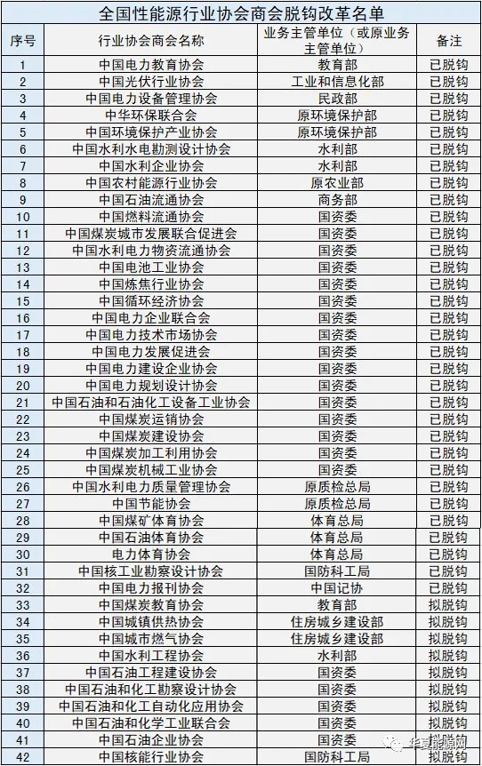 目前,在此次脱钩改革的795家全国性行业协会商会中,与能源相关的协会有42家,其中已经与行政机关脱钩的协会32家,拟脱钩企业10家。