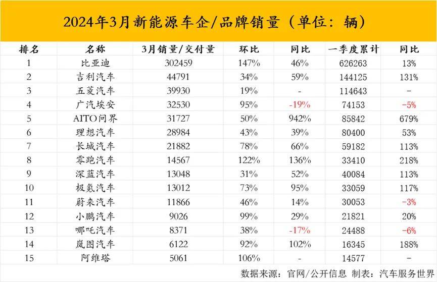 根据汽车服务世界不完全统计,表格中 15 家新能源车企中,除了广汽埃安、哪吒汽车同比出现下滑外,其余车企在今年 3 月销量/交付量均实现了同环比大幅上涨。