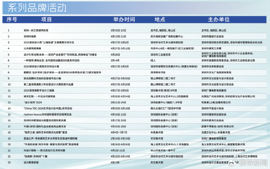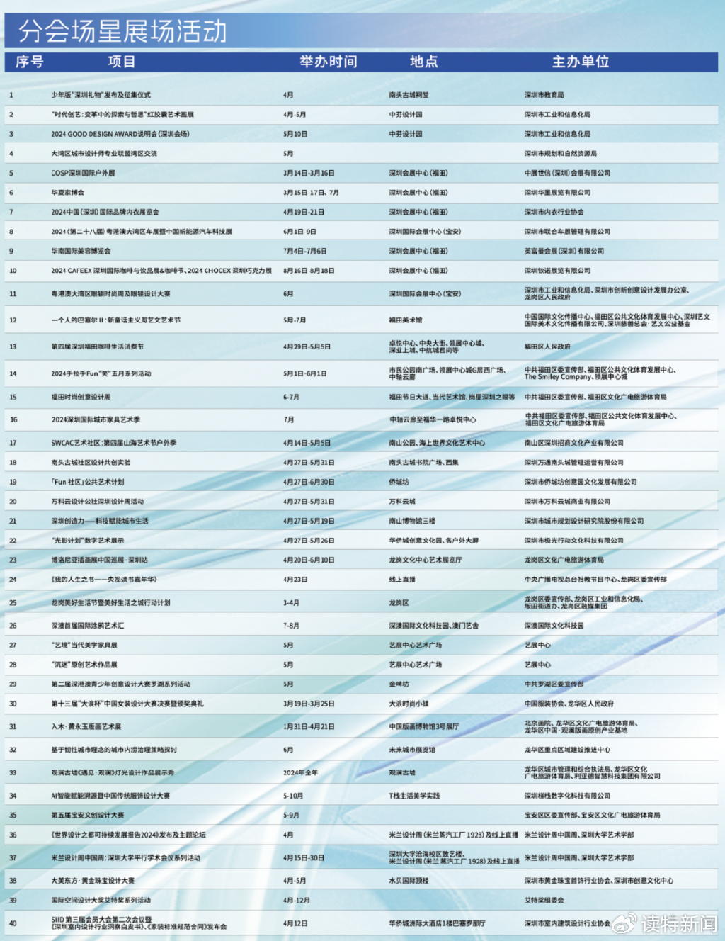 据悉,本届深圳设计周包括4项主题活动,即1场开幕式、1场全球“设计之都”城市圆桌对话暨全球设计师大会、1场环球设计大奖“鲲鹏奖”颁奖典礼获奖作品展及主宾国活动。此外,还有23场系列品牌活动、N场分会场星展场及全年创意设计活动。