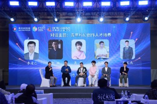 紫光教育集团总裁、科幻基地副主任李凌己,科幻作家阿缺,科幻作家吴楚,科幻作家厉海川,高校科幻平台负责人赵文杰围绕“青年科幻创作人才培养”的主题进行对谈,本环节由中国科学技术出版社有限公司与清华大学联合培养博士后彭超主持。