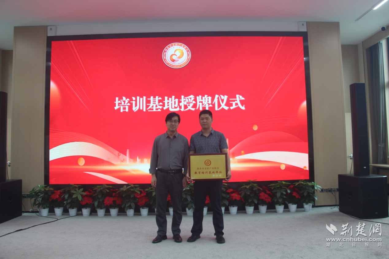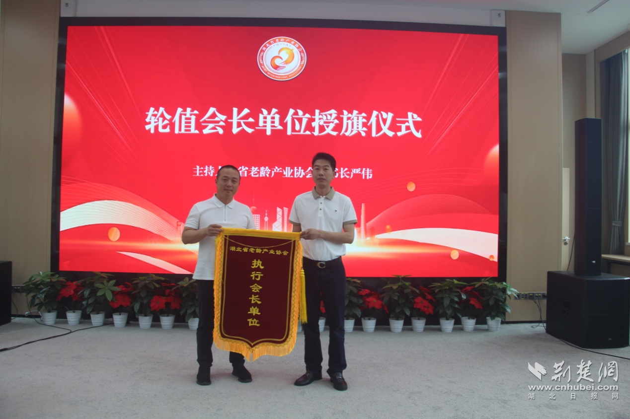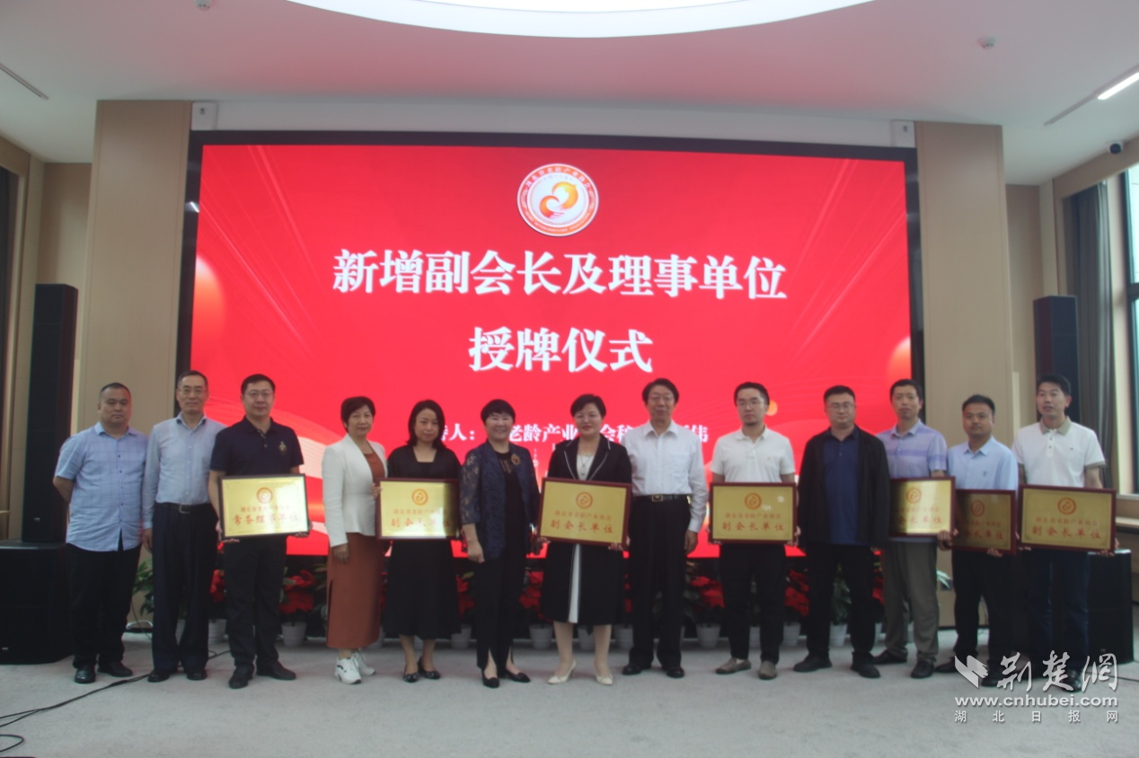 吴世民等领导为增补副会长及理事单位授牌。湖北省老龄产业协会党支部书记肖本信、秘书长严伟分别为中健(湖北)人力资源开发有限公司授教育培训基地单位牌匾、轮值会长单位授旗。会上进行了银发经济重点项目推介。