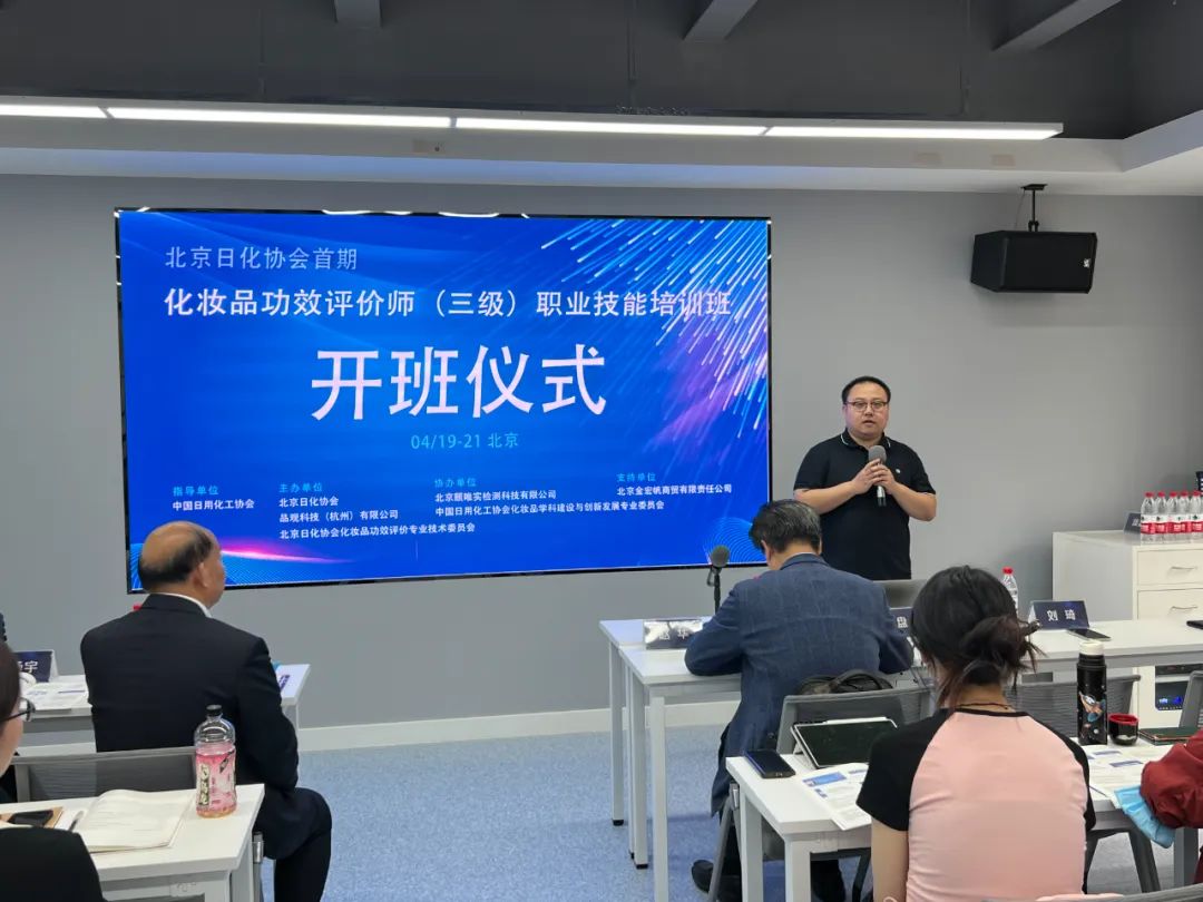 2024年4月19日-21日,在中国轻工业联合会职业能力评价中心和中国日用化工协会评价总站指导下,由北京日化协会联合北京日化协会化妆品功效评价专业技术委员会、品观科技(杭州)有限公司主办,北京颐唯实检测技术有限公司、中国日用化工协会化妆品学科建设与创新发展专业会员会协办,北京金宏帆商贸有限责任公司为支持单位的首期化妆品功效评价师(三级)职业能力评价培训班在北京成功举办。