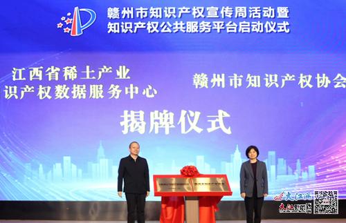 在赣州市知识产权宣传周活动暨知识产权公共服务平台启动仪式上,张骅、唐云志共同为赣州市知识产权协会揭牌。