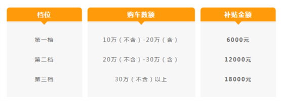 ◆第三档:购买金额30万元(不含)以上的,可领取18000元/台的购车补贴。