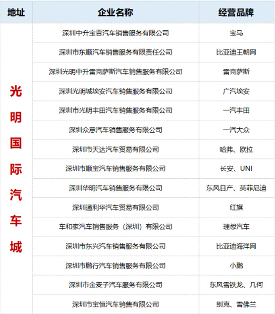 光明国际汽车城的汽车零售企业均在光明区注册纳统,符合申领条件。企业名单如下: