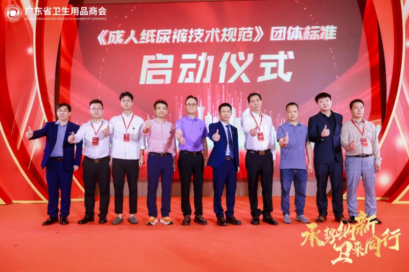 年会盛典环节,广东省卫生用品商会会长邓伟添、浙江省卫生用品商会会长吴跃、福建省卫生用品商会监事长郭尚接到场致辞,并现场见证《成人纸尿裤技术规范》团体标准启动仪式。