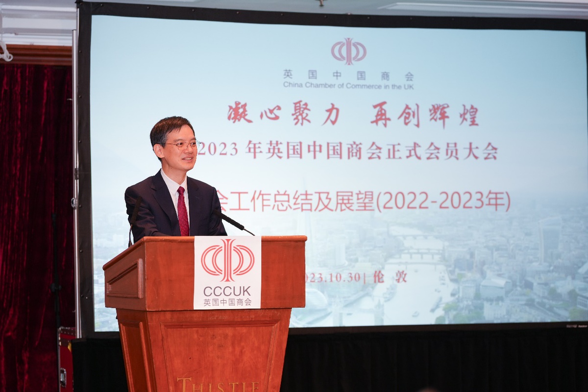 中国日报网11月1日电 当地时间10月30日,以“凝心聚力 再创辉煌”为主题的英国中国商会2023年中资企业会员大会在伦敦召开。中国驻英国大使郑泽光出席会议并发表主旨演讲、中国驻英国使馆公使包玲进行总结发言。会议选举产生了新一届商会理事会,29家理事单位涵盖了金融、科技、通讯、能源、地产、贸易、媒体等多个领域,近170位中资企业会员代表参加了本次会议。