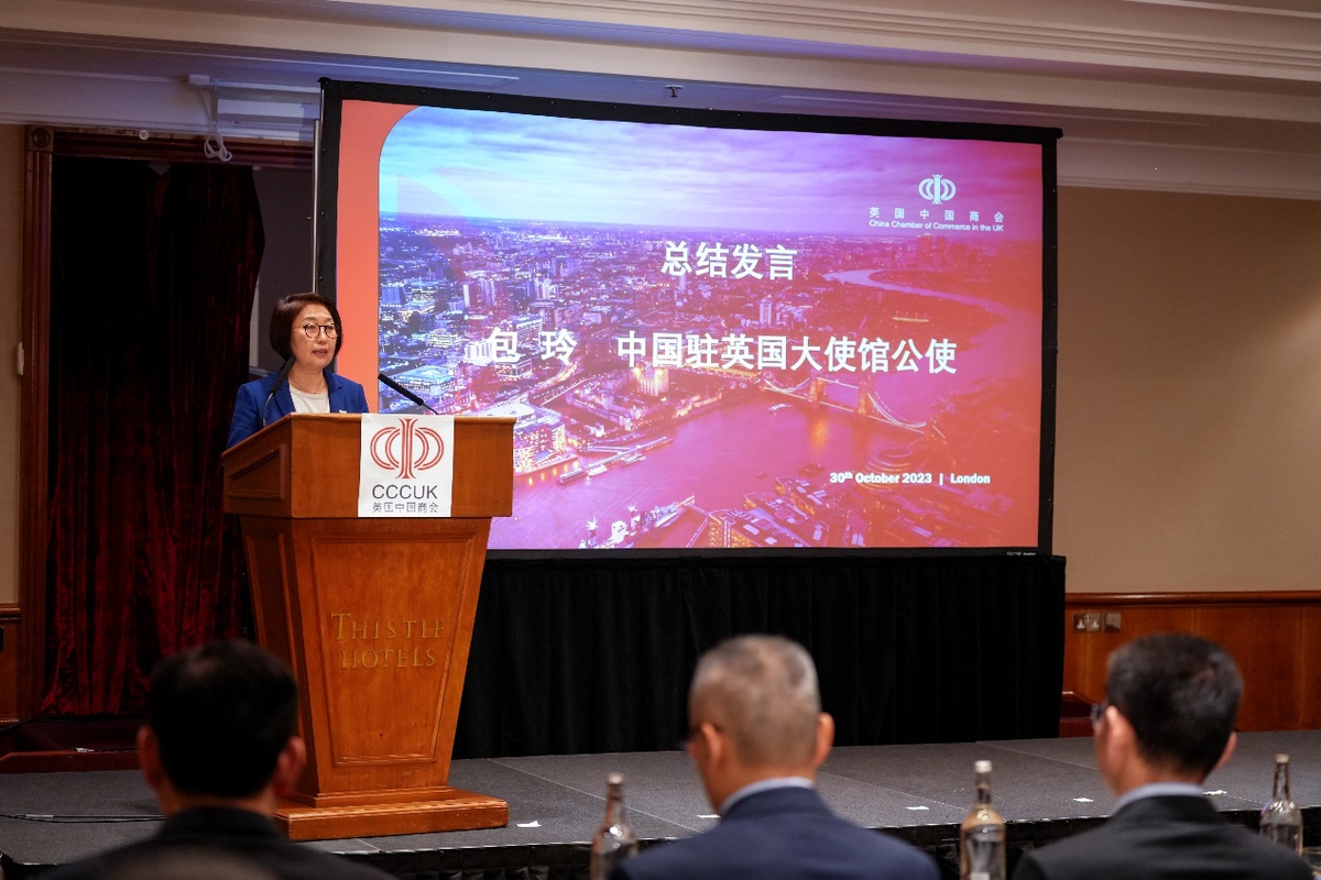 中国驻英国使馆公使包玲在总结发言中充分肯定了商会及所有在英中资企业在促进中英经贸合作中所取得的突出成绩和重要贡献,并强调了商会在推动高层次经贸交往、促进与官方政策沟通、服务在英中资企业发展三方面发挥的重要平台作用。
