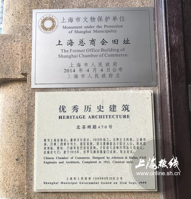上海总商会存在了半个多世纪,上个世纪20世纪初曾是中国工商业最为集聚的地方,还孕育了中国第一代工商业企业家。这幢顶级设计的大楼为西方古典主义风格,立面对称,四坡屋顶,竖三段和横三段划分。当时投入经费约白银十万余两,聘请了上海颇有名望的英国建筑事务所通和洋行负责设计,是上海一座具有代表性的西方古典主义特征的建筑。在1920年前后,沿北苏州路扩建了门楼作为上海总商会的主入口,以及一段水刷石围墙,以连接主楼和门楼。”