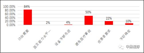 通过调查数据反映,医院检查项目多系“诊治需要”的占高达84%,“避免医疗事故”的占50%,“应患者要求”的占22%,一定程度说明了造成检查项目多的主要因素有诊治需要、避免医疗事故、应患者要求,其中最关键因素主要是诊治需要。但也不排除部分医生是为了避免医疗事故和应患者要求,造成检查项目多的情况,这也是群众“看病难”又一重要因素,详见图1—14。
