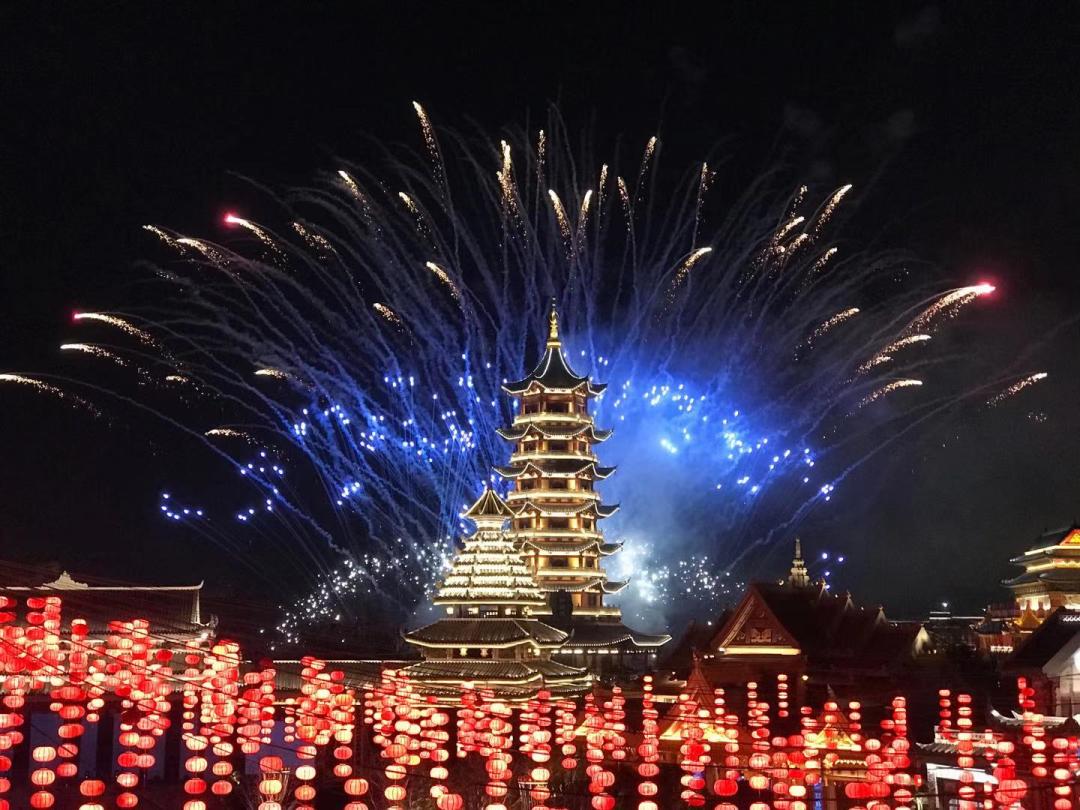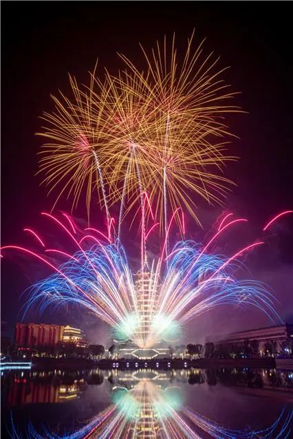华灯初上,荆州方特节庆广场的喷泉在人声鼎沸中翩翩起舞,游客在绚烂的烟花下和科技感十足的无人机精彩表演中狂欢……
