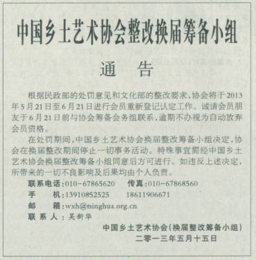 4月25日,中国乡土艺术协会召开整改换届筹备组第二次会议,讨论并拟定了内部整改方案和换届工作方案,成立了换届大会筹备会务工作组。根据会议决定,协会近日在《中国文化报》、《公益时报》等媒体发布通告:定于2013年5月21日至6月21日进行会员重新登记认定工作。