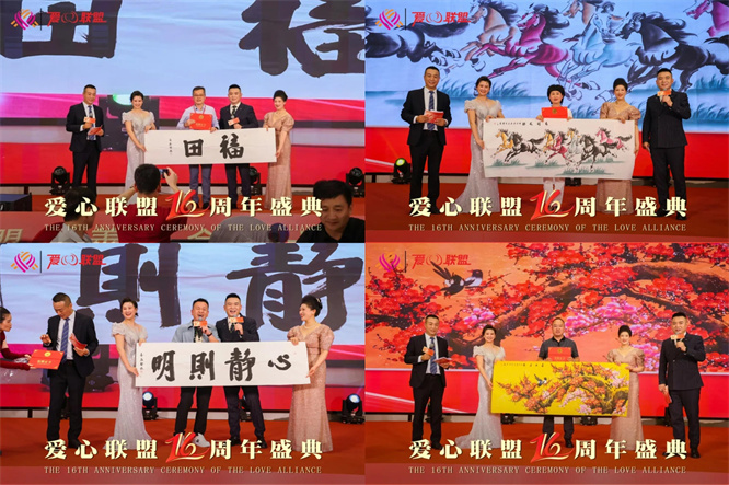 当晚,举行了盛大的十六周年庆祝晚宴。晚宴上不仅有精彩的节目表演,还举行了爱心拍卖活动。四件拍品被联盟成员施余国、王州明、宋邦宁、张青霞成功拍得,共计筹集善款175520元,将全部用于支持基金会的公益事业。