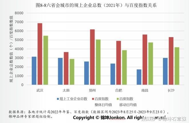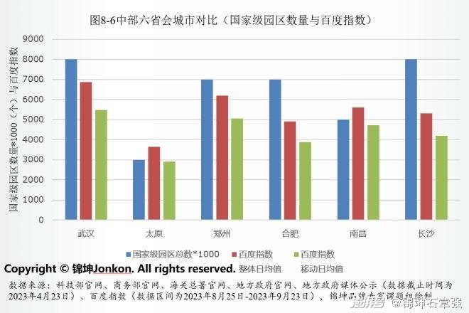 通过中部六省会城市的对比,可以看到这些优质的国家级园区对城市影响力的带动作用明显。优质园区由于本身的属性、引进的企业、覆盖的范围、囊括的人群、发展的空间、知名度大小等原因,会提高城市的知名度。故园区不仅仅对城市的产业发展息息相关,对城市的品牌影响力的建设也大有帮助。从图8.6中可看出,城市的优质园区数量越少,城市品牌知名度越低。