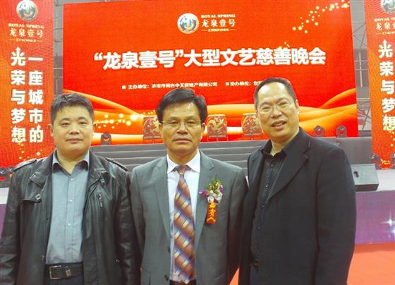 图示:“龙泉一号”大型文艺慈善晚会现场济南市闽台中天房地产有限公司董事长林福伙先生和嘉宾中国新闻媒体记者委员会主任、中国企业家人脉促进会常委会长、中国营销策划人委员会主任、中国营销企划运管中心主任万祥军,德州高新区招商局局长毛成伟在慈善晚会现场交流并留念