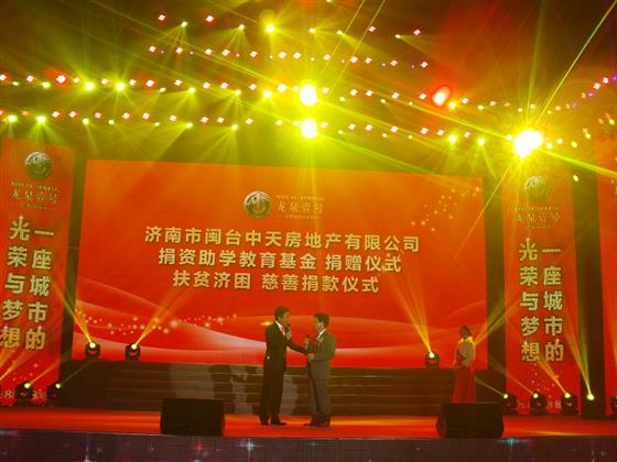 “只要心中有爱,你就能伸出千只手帮助别人,只要心中有爱也会有千只手伸出来帮助你。”,董事长林福秋先生表示,扶危济困、勇担道义是我们中华民族传统美德,也是一个企业应有的社会责任。晚会现场,济南市闽台中天房产有限公司董事长林福秋先生慷慨解囊,现场为我章丘市教育事业捐献出300万元,为市民政局捐出30万元以支持我市的慈善事业,并且在此后几年内要连续每年为我市慈善事业捐献30万元,积极投身章丘教育事业,为章丘教育事业和慈善事业做出自己的贡献,也希望这样的善举能感染更多的人献出爱心帮助弱势群体。