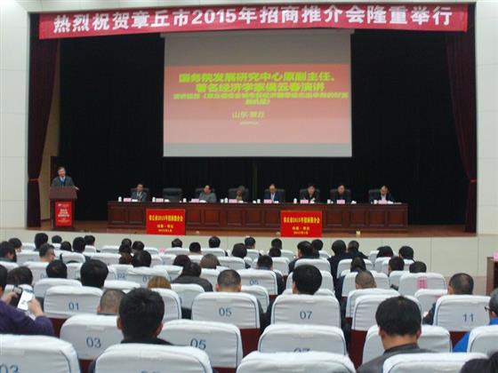 章丘市委副书记、市长刘天东作了主题演讲,向大家介绍了章丘的发展优势和五大重点招商区域、四大重点招商项目情况。他说,近年来,章丘全面深化改革开放,加快经济社会发展,名列2014年全国科学发展百强县市第31位、最具投资潜力百强县市第6位,具有区位、产业、载体、文化、生态、服务六大优势。当前,章丘处在经济转型升级、城市拓展提升、城乡加快融合的关键时期,适应经济新常态,加大招商选资、招才引智力度成效,仍然是我们坚定不移的战略选择。