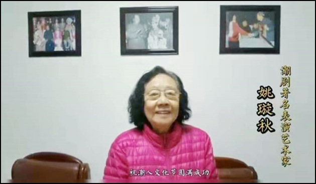 国家级非遗潮剧代表性传承人、中国戏曲学院名誉教授、广东潮剧院名誉院长、著名潮剧表演艺术家、国家一级演员,“深圳市潮人文化节”艺术顾问、文化形象代言大使姚璇秋专门发来祝贺视频。
