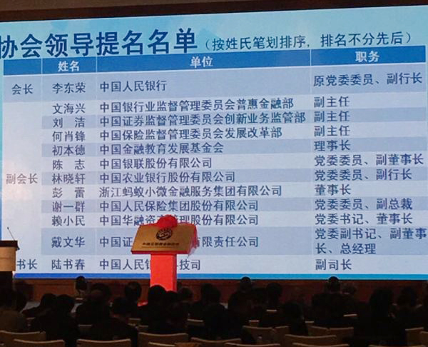 中国人民银行原副行长、61岁的李东荣当选为会长,中国人民银行科技司副司长陆书春当选为秘书长。出任副会长的还有银监会普惠金融部副主任文海兴、证监会创 新部副主任刘洁、保监会发展改革部副主任何肖锋、中国金融教育发展基金会理事长初本德等。