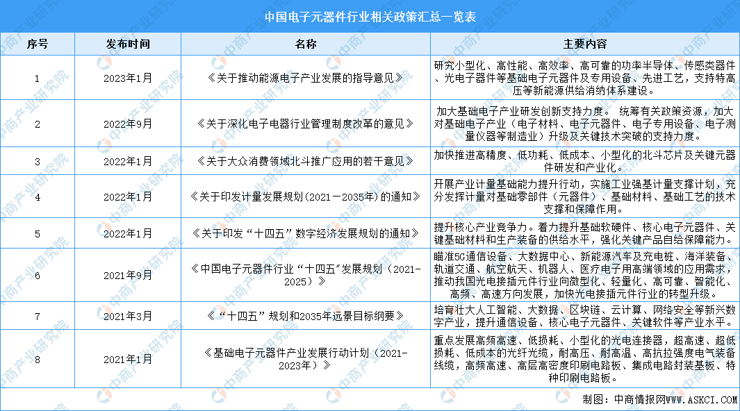 中商情报网讯:电子元器件是支撑信息技术产业发展的基石,也是保障产业链供应链安全稳定的关键。面对百年未有之大变局和产业大升级、行业大融合的态势,加快电子元器件及配套材料和设备仪器等基础电子产业发展,对推进信息技术产业基础高级化、产业链现代化,乃至实现国民经济高质量发展具有重要意义。因此,国家先后制定了相关政策,对行业的发展支持力度持续加大,将进一步促进行业的高速、高质量发展。电子元器件行业具体政策如下: