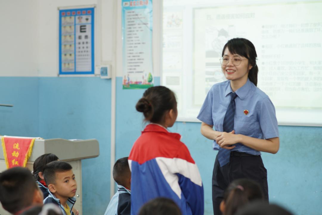 此次普法课,韦法官针对小学生的心理特征和行为特点,“量身定制”了课程内容。课上,韦法官用通俗易懂的法言法语,以新修订的《未成年人保护法》和《刑法修正案(十一)》为切入点,围绕反对校园欺凌、重视校园安全、预防毒品犯罪、加强反邪教意识等方面进行了讲解。通过向学生深入分析未成年人犯罪刑罚的适用,讲解校园欺凌造成的危害,以法论事,劝诫同学们一定要团结友爱、互帮互助;通过生动有趣的反邪教宣传片,引导学生学法明理,学会识别邪教组织的行骗伎俩以及如何有效抵御和防范邪教侵害;通过审理的贩毒典型案例,以案释法,进一步加深对毒品危害的认识,鼓励同学们积极参与禁毒活动,争当“禁毒小卫士”;通过引导孩子们朗诵相关法条,教导学生们加强法律意识,学会运用法律武器保护自己和身边的人,依法护己。