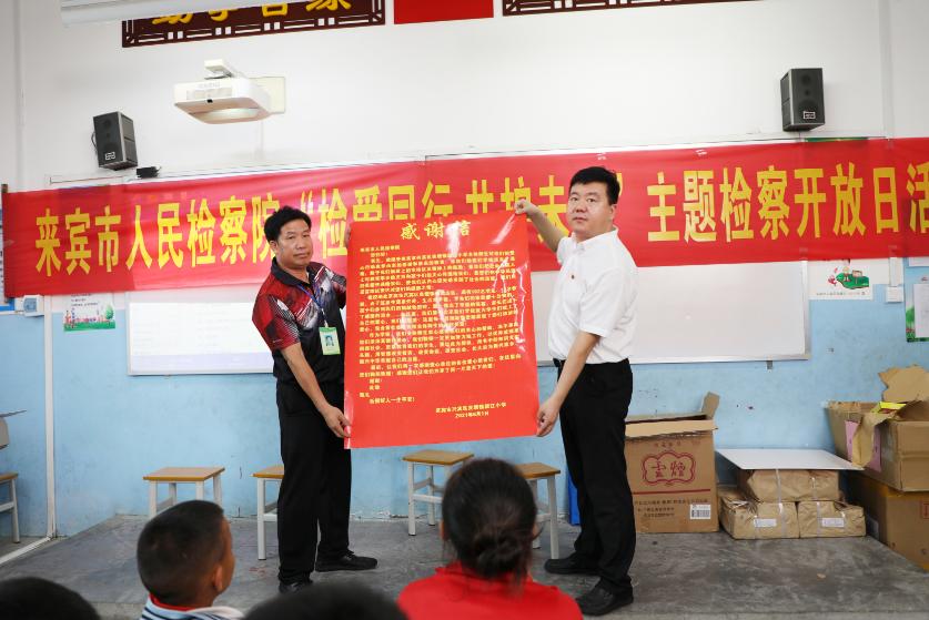 最后,兴宾区检察院为五山镇周罗教学点赠送了体育用品及学习文具等“六一”礼物。