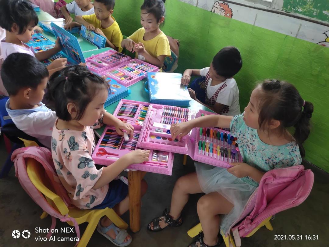 孩子们开心的查看收到的“六一”彩笔礼物