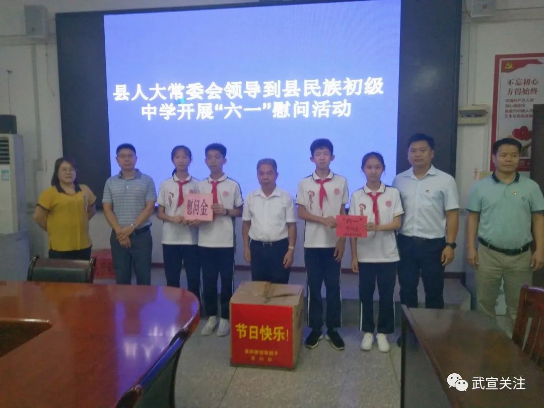 在国际“六一”儿童节之际,6月1日,武宣县县领导分组来到县城和各乡镇部分学校开展“六一”慰问活动,与少年儿童一起欢庆节日,为他们送上节日礼物和温馨祝福,并向广大教育工作者致以诚挚问候。