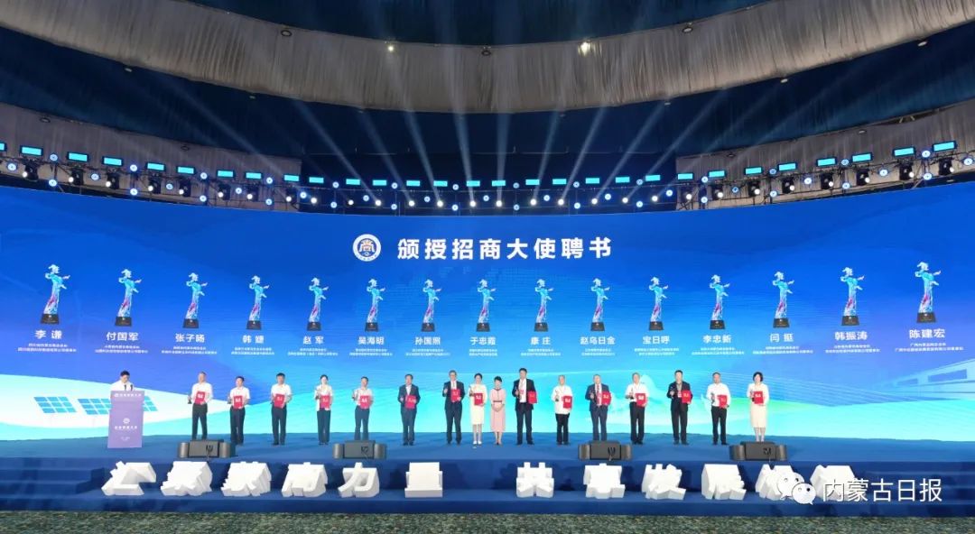 全国工商联党组成员、副主席杨佑兴宣读了全国政协副主席、全国工商联主席高云龙的致辞,自治区党委书记孙绍骋致辞,自治区党委副书记、自治区主席王莉霞主持开幕式并为海内外商会会长代表颁授招商大使聘书。自治区政协主席张延昆,全国工商联有关领导和部分驻华使节、中国工程院院士、经济学家,自治区有关领导出席。自治区副主席杨进介绍了内蒙古经济社会发展情况。