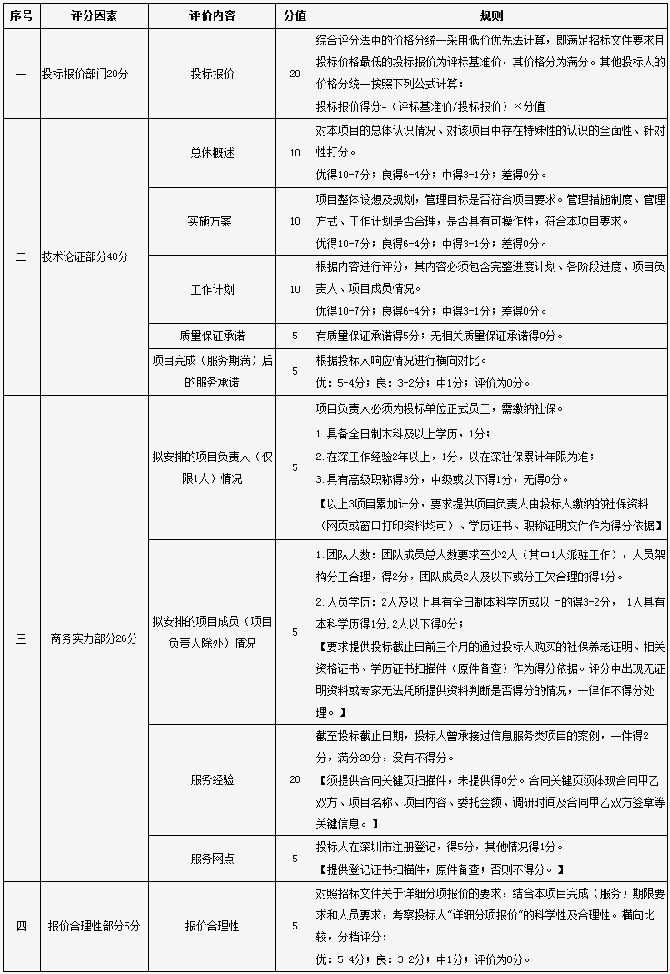评审小组会按综合得分由高到低的顺序排出各有效投标的名次,得分最高的投标人为本项目中标人。评分指标如下: